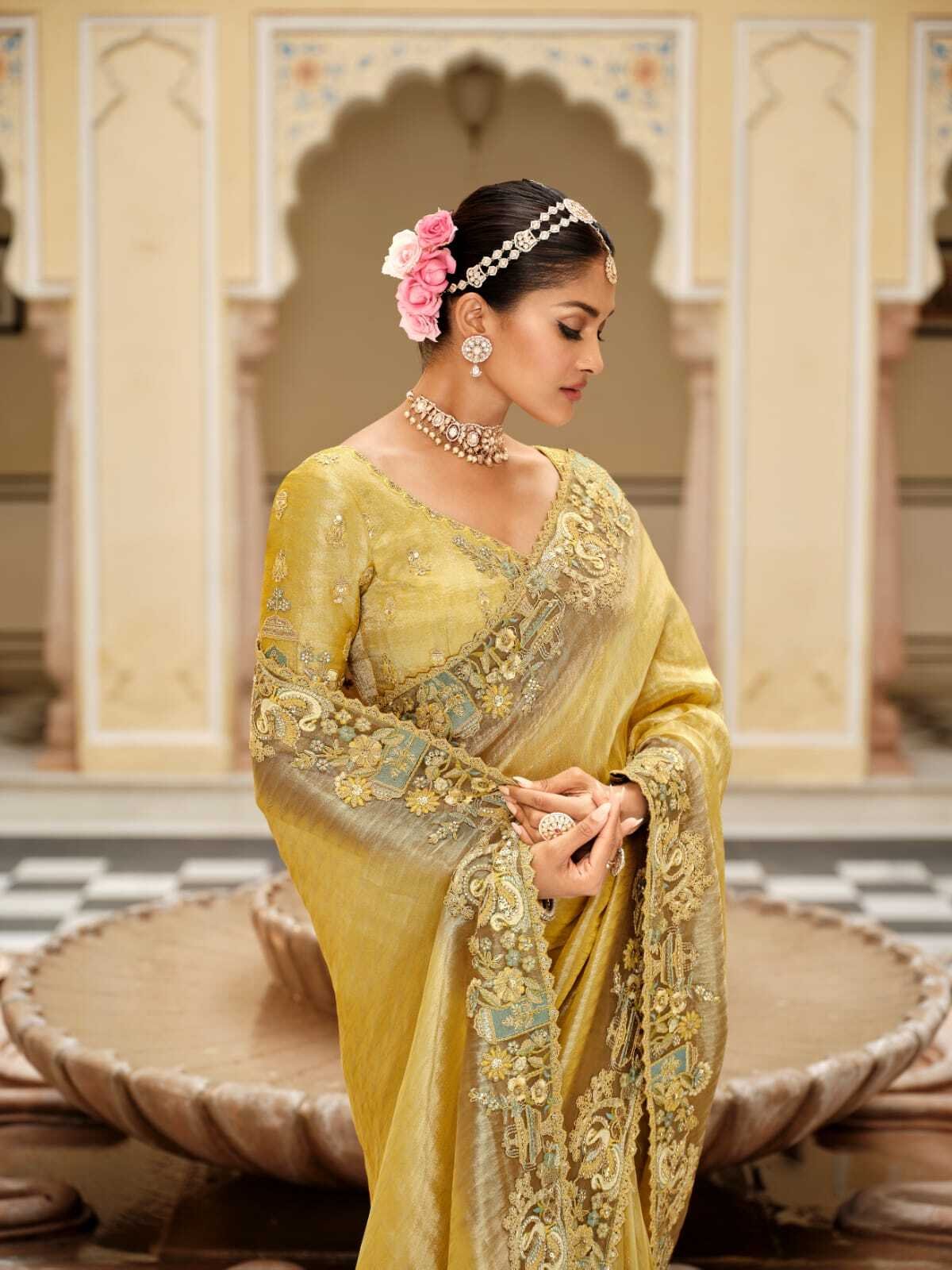 golden yellow tissue zari saree, adorned with intricate olive green and pastel embroidery along the border and pallu. The delicate handwork, zari weaving, and patch detailing make it the perfect choice for weddings, sangeet, engagements, and festive occasions. Paired with a matching silk blouse in olive green, this traditional saree blends heritage artistry with modern grace. Crafted with rich tissue zari fabric, this saree shines with luxurious texture and regal appeal, making it a must-have for your special wardrobe.