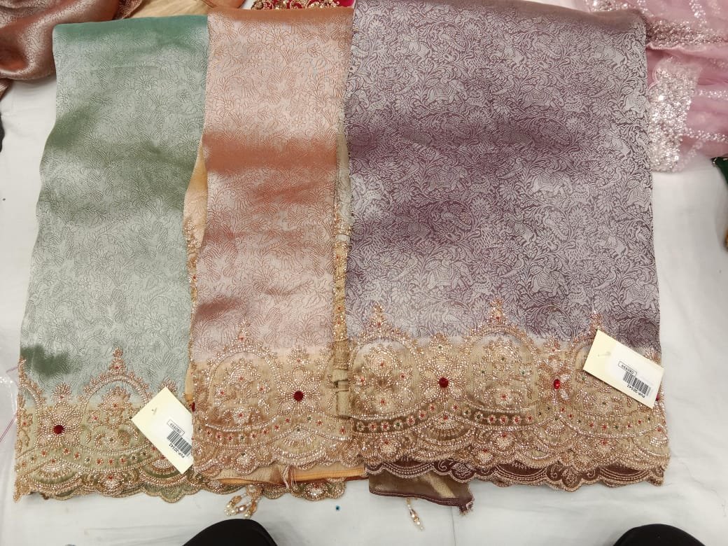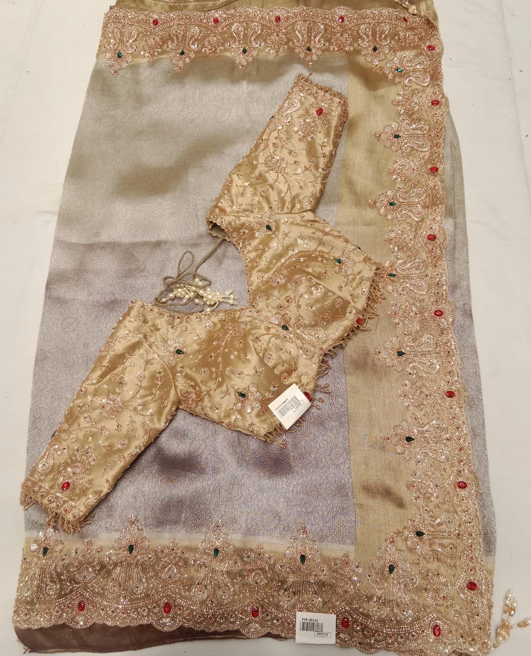 Indulge in timeless elegance with this luxury hand-embroidered saree, meticulously crafted for weddings and grand celebrations. Designed in a refined neutral tone, this saree is adorned with intricate hand embroidery, delicate zari work, and fine embellishments, creating a rich and regal appeal.